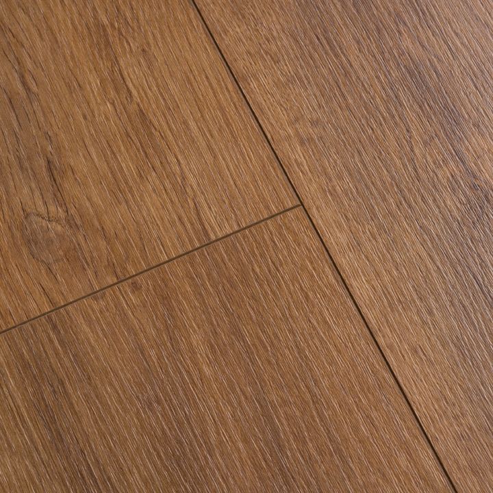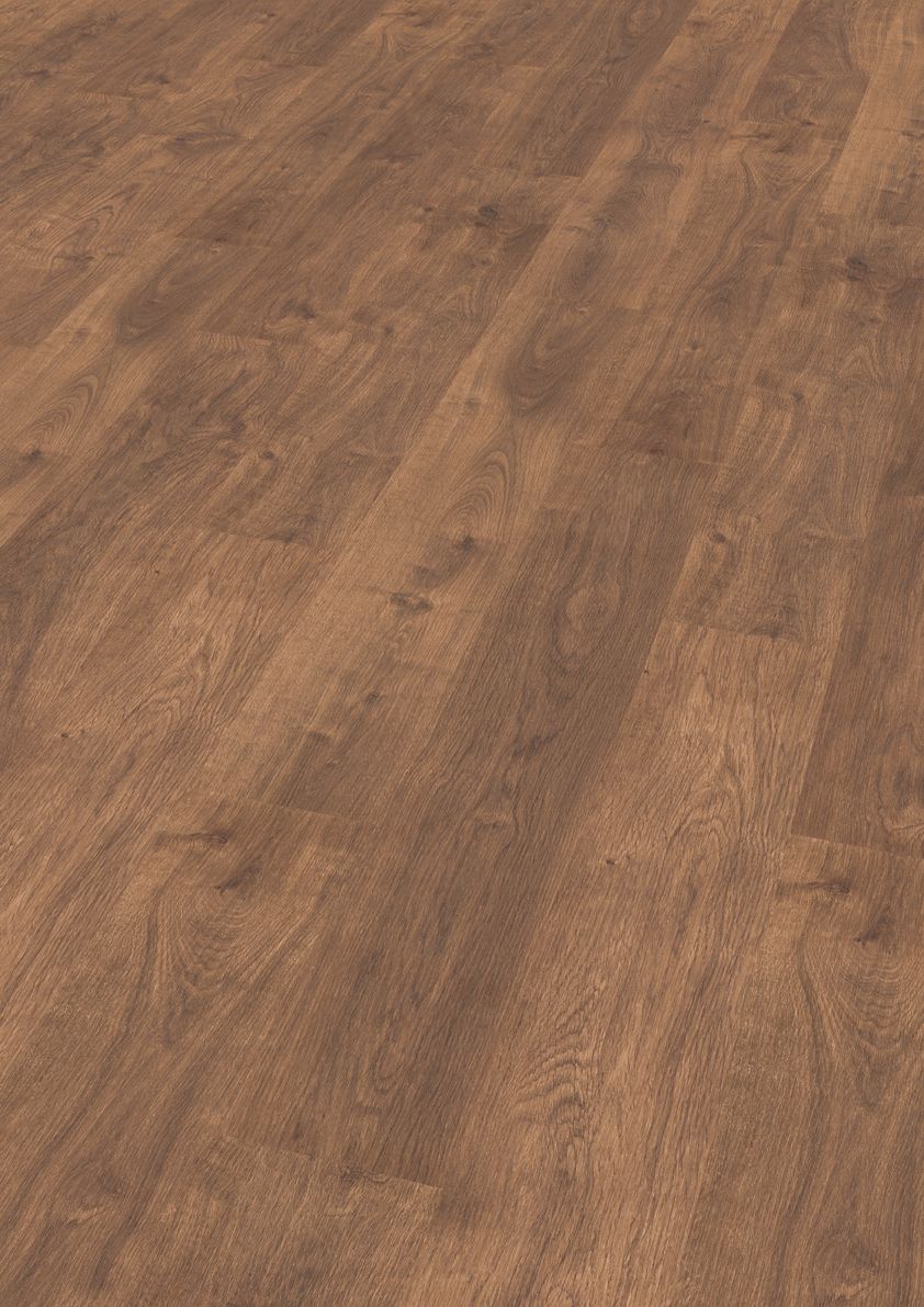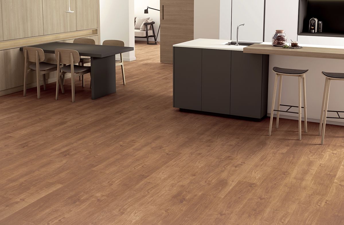 El tono tostado del diseño Roble Vintage aporta personalidad al espacio y sus vetas ligeramente más oscuras transmiten una sensación de movimiento. Su acabado mate Dry Touch le da una textura realista de poro abierto.